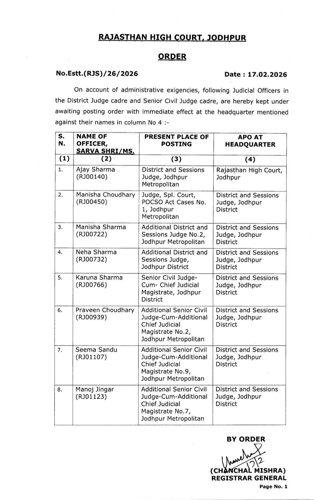 मनोज कुमार सोनी।जोधपुर। राजस्थान हाईकोर्ट के ताज़ा प्रशासनिक आदेश ने जोधपुर के न्यायिक महकमे में अचानक हलचल बढ़ा दी है। एक साथ 8 न्यायिक अधिकारियों को APO किए जाने के फैसले को सामान्य प्रशासनिक प्रक्रिया से कहीं अधिक गंभीर माना जा रहा है।
