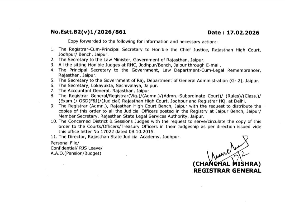 मनोज कुमार सोनी।जोधपुर। राजस्थान हाईकोर्ट के ताज़ा प्रशासनिक आदेश ने जोधपुर के न्यायिक महकमे में अचानक हलचल बढ़ा दी है। एक साथ 8 न्यायिक अधिकारियों को APO किए जाने के फैसले को सामान्य प्रशासनिक प्रक्रिया से कहीं अधिक गंभीर माना जा रहा है।