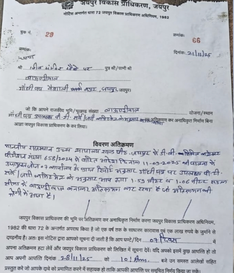 मनोज कुमार सोनी/जयपुर। जयपुर विकास प्राधिकरण (JDA) में कार्यरत प्रवर्तन अधिकारी अरुण कुमार पूनिया को निलंबित कर दिया गया है। लेकिन इस पूरे मामले ने एक बार फिर यह सवाल खड़ा कर दिया है कि क्या सिर्फ छोटे अधिकारियों को बलि का बकरा बनाकर बड़े अधिकारी खुद को बचाते रहेंगे? क्या धार्मिक भावनाओं की अनदेखी करने वाले, आदेश देने वाले, निरीक्षण करने वाले और फाइल पास करने वाले अफसरों के खिलाफ कोई कार्रवाई होगी? या यह निलंबन सिर्फ जनता का गुस्सा शांत करने का एक ढोंग है? घटना वैशाली नगर क्षेत्र के गांधीपथ स्थित भगवान महादेव मंदिर से जुड़ी है। सड़क चौड़ीकरण अभियान के तहत JDA की टीम अतिक्रमण हटाने निकली थी। दुकानों और मकानों पर कार्रवाई होनी थी, लेकिन दिमागी स्तर की हदें पार करते हुए JDA अफसरों ने नोटिस सीधे “भगवान शिव मंदिर” के नाम चस्पा कर दिया। ना किसी पुजारी का नाम, ना किसी समिति का। सीधा “भगवान शिव” को जवाब देने का आदेश!